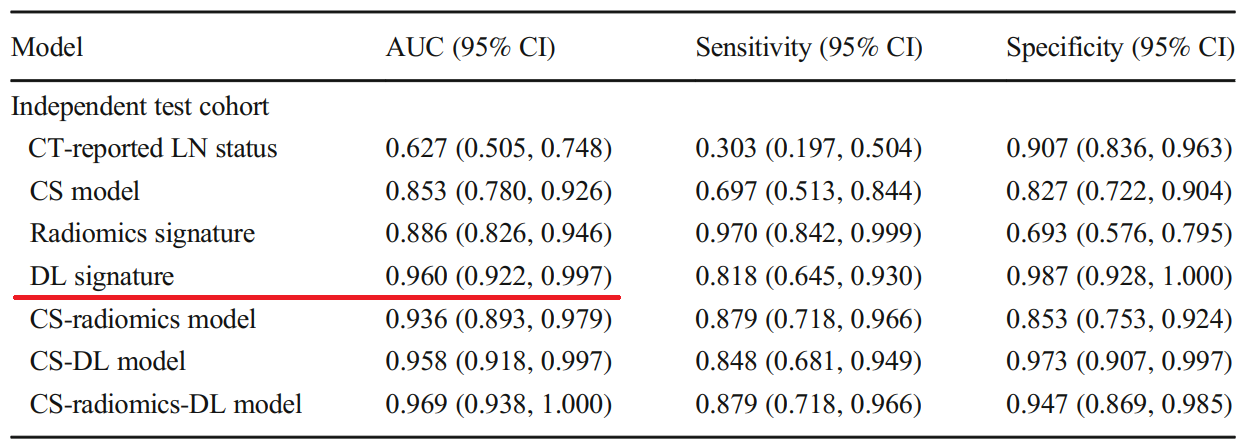 Ma, Xiaoling, et al. "Development and validation of a deep learning signature for predicting lymph node metastasis in lung adenocarcinoma: comparison with radiomics signature and clinical-semantic model." European Radiology (2022): 1-14.
