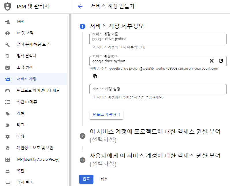 서비스 계정 세부정보에 대충 계정 이름, ID를 넣습니다.