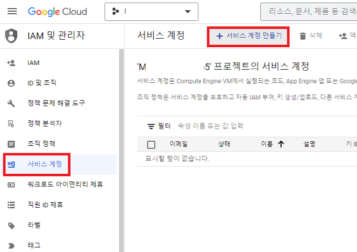 서비스 계정 탭에 들어간 후, '서비스 계정 만들기' 버튼을 클릭합니다.